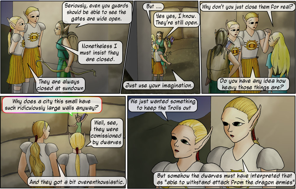 Ayne's comment in frame 1 makes it sound like all soldiers are stupid. And I'd rather you not make fun of dwarves; they may be a bit eccentric on occasion, but I've read about some really good ones. Have you ever really read descriptions of dwarven halls? They build everything on a massive scale.