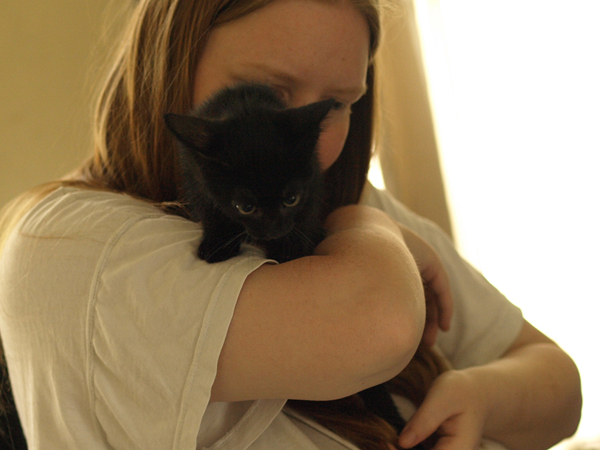 I was cycling to my mother yesterday, taking a road through a small park next to the highway around Antwerp when I see a small black furry thing bouncing towards me. I look more closely and it turns out to be a kitten, running alone. Surprised, I stop. Some old people are cycling along the path in the same direction as the kitten and I wonder briefly whether they are the owners, but they pass me and the kitten can't keep up with them. Clearly they are not together.